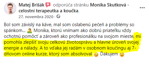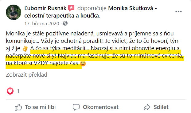 S Monikou jsem se setkala v online světě. Působila velmi vyrovnaně a klidně. Při osobní setkání mě Monika dokázala jen svojí přítomností během pár minut přeladit, zklidnit moji mysl a navést mě na jinou energetickou vlnu. Svým otevřeným přístupem pomoci s řešením určitého úkolu. Když jsem ze setkání s Monikou odcházela, měla jsem vnitřní pocit, že můj úkol je poloviční, najdu řešení a vše zvládnu. Monika dokáže lidem nabídnout svoji vnitřní krásu, harmonii, a svým příkladem lidi vést. Zkušenost mám s její léčebnou meditací. Když jsme s manželem prodělávali onemocnění. Už při prvních zvucích hudby jsem cítila uvolnění, které Monika podpořila jemným hlasem, který hladí po duši. Celou meditaci provází jemně a citlivě. Moniku doporučuji ženám jako jsem já, energickým, cílevědomým, které o to více touží po zklidnění duše, uvolnění těla a nastavení pocitu harmonie.